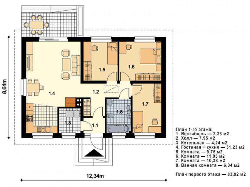 Дом имеет размеры 12×9 метров и площадь 84 м2.