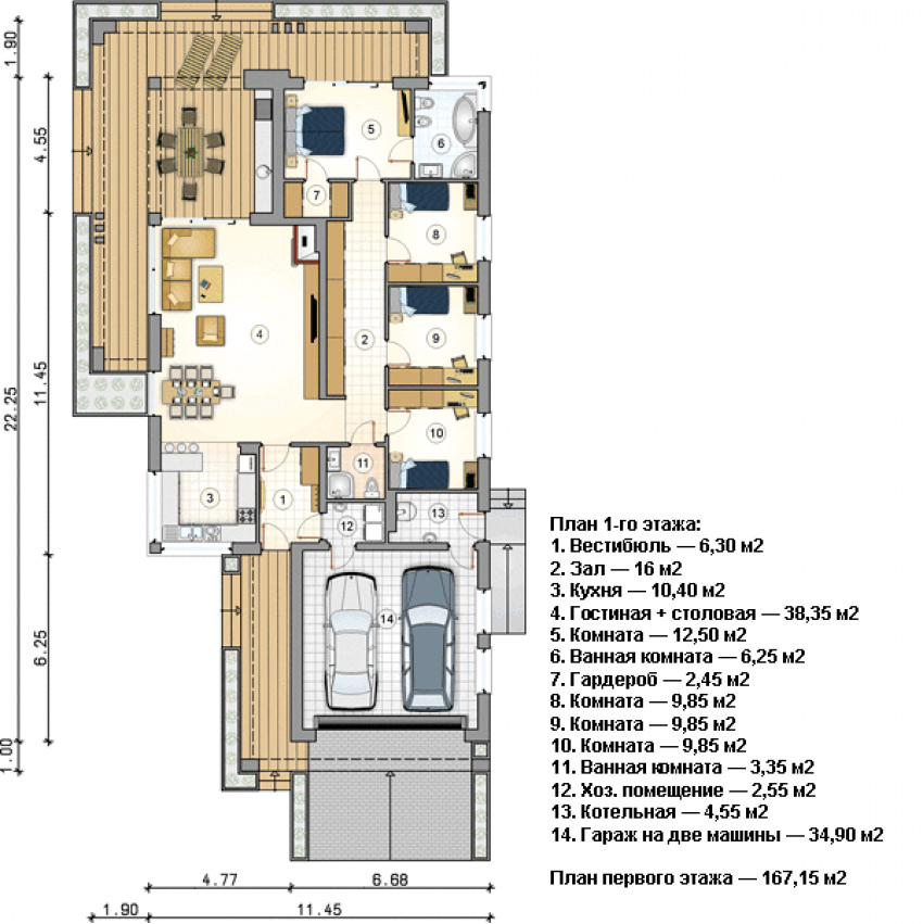 Дом имеет размеры 11х22 метра и площадь 167м2.